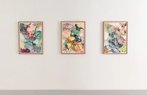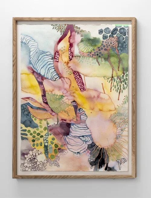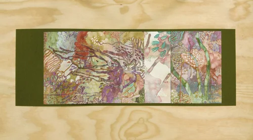 Når jeg maler har jeg en følelse av å dykke inn i et landskap av farger og former. Boken ‘the woods we live in’ er en forlengelse av denne ideen. Fargene i risomaskinene ga meg muligheten til å eksperimentere med farger og sammensetninger som jeg ellers ikke ville gjort når jeg maler. Det er et element av tilfeldigheter med å jobbe med risografi som jeg kjenner igjen fra akvarellen. Man kan kontrollere prosessen til en viss grad, men til syvende og sist er det maskinen som bestemmer utfallet. Jeg liker de små forskyvningene som skjer i bildet, som sier noe om at dette er et håndverk, og at hvert bilde er et unikum.